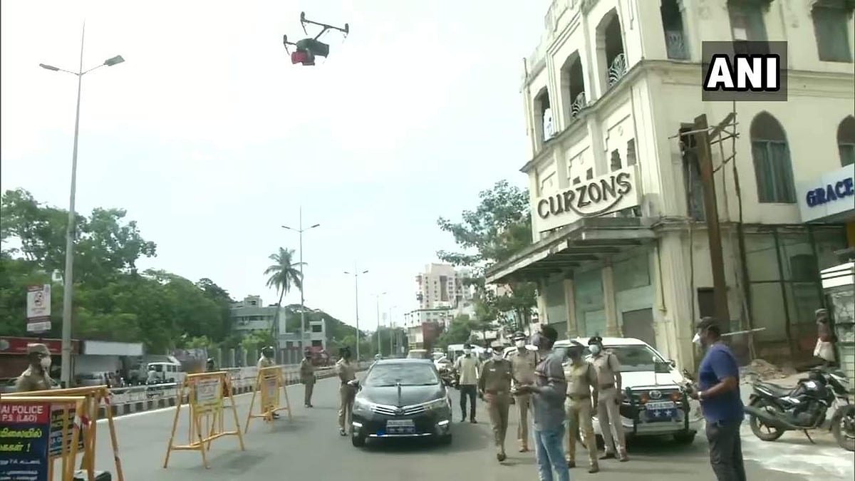 சாலைகளில் மக்களின் நடமாட்டத்தைக் கண்காணிக்க சென்னை காவல்துறையினர் டிரோன் கேமராக்களைப் பயன்படுத்தி வருகிறார்கள்.