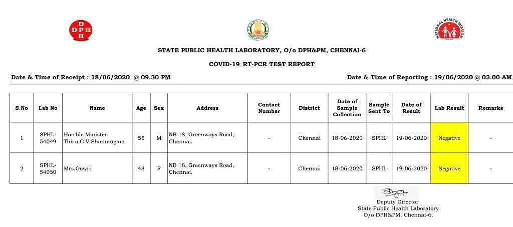 அதில், அவருக்கு கடந்த 18 ஆம் தேதி கரோனா பரிசோதனைக்காக மாதிரிகள் எடுக்கப்பட்டதாகவும், அதைத் தொடர்ந்து 19 ஆம் தேதி பரிசோதனை முடிவுகள் வந்ததாகவும் அதில் சி.வி. சண்முகத்துக்கு கரோனா தொற்று இல்லை என குறிப்பிடப்பட்டுள்ளது.