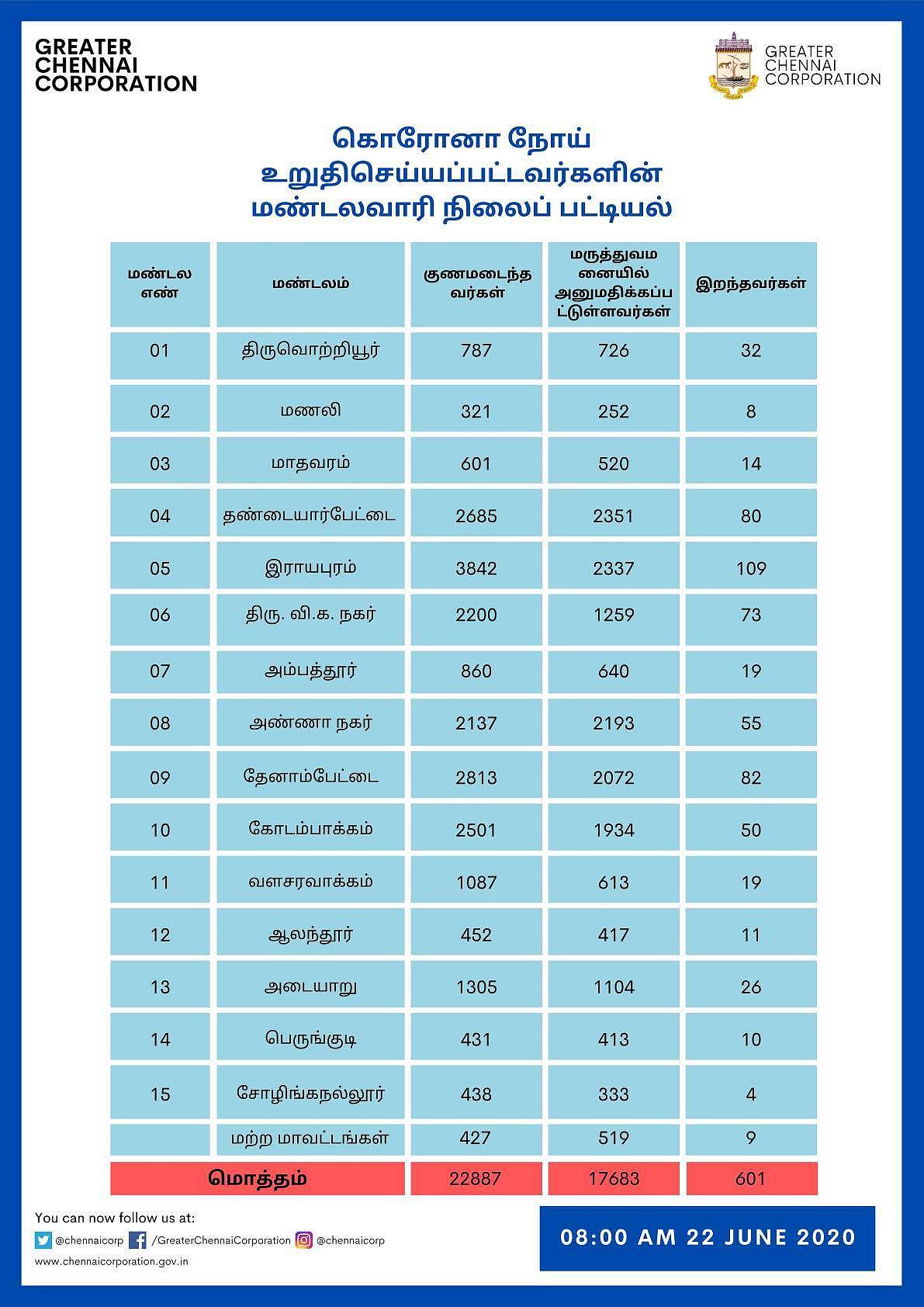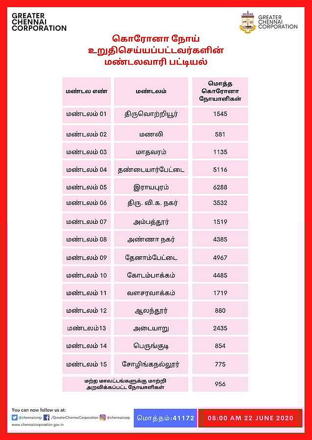 தொடர்ந்து, சென்னையில் மண்டலவாரியாக கரோனா பாதித்தோர் விவரத்தை சென்னை மாநகராட்சி வெளியிட்டுள்ளது. மொத்தம் உள்ள 15 மண்டலங்களில், அதிகபட்சமாக ராயபுரத்தில் 6,288 பேருக்கு தொற்று உறுதி ஆகியுள்ளது.