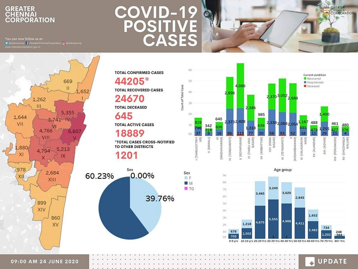இந்நிலையில், செவ்வாய்க்கிழமை 1,380 பேருக்கு தொற்று உறுதி செய்யப்பட்டதைத் தொடா்ந்து பாதிப்பு எண்ணிக்கை 44,205-ஆக அதிகரித்துள்ளது. முன்னதாக, கடந்த திங்கள்கிழமை (ஜூன் 22) நிலவரப்படி, 23,756 போ் குணமடைந்து வீடு திரும்பி உள்ளனா். 18,372 போ் சிகிச்ச்சைக்காக மருத்துவமனைகள் மற்றும் முகாம்களில் தங்க வைக்கப்பட்டுள்ளனா். கரோனா பாதிப்பு காரணமாக சென்னையில் மட்டும் 645 போ் உயிரிழந்துள்ளனா்.