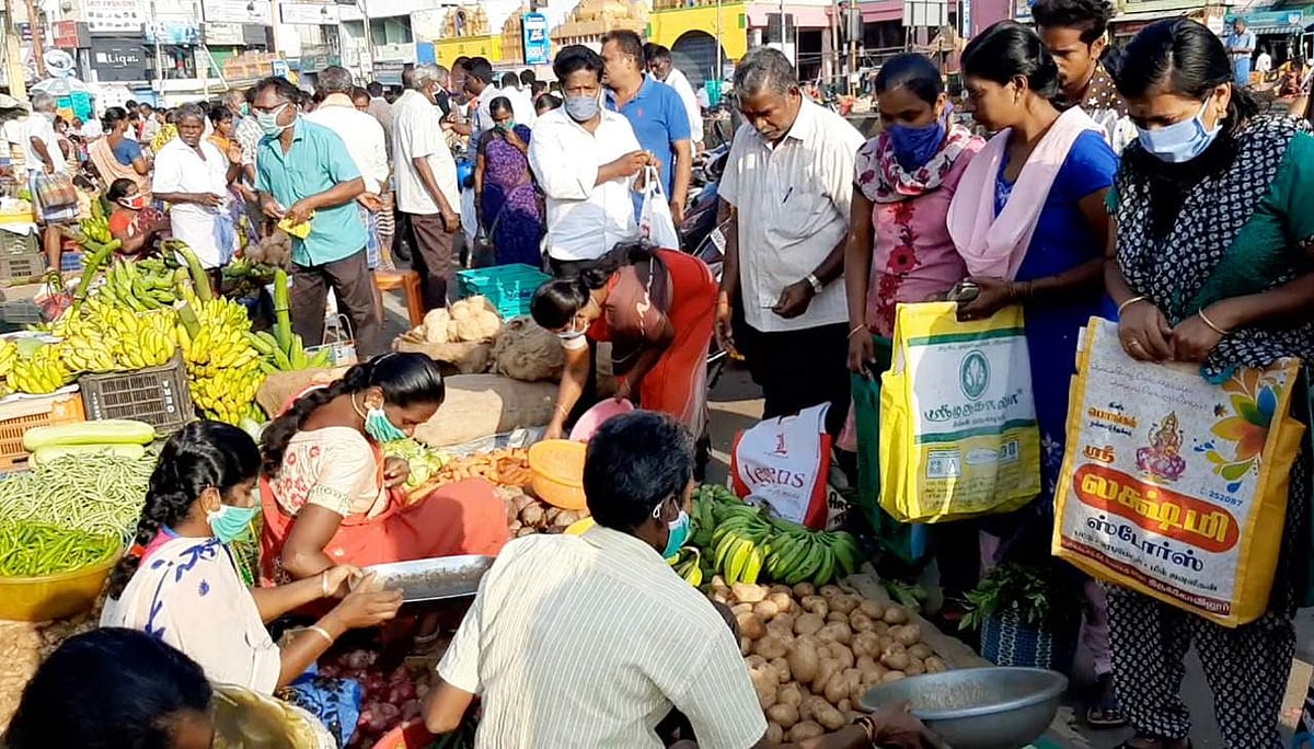 144 தடை உத்தரவை மீறி சேலம் சூரமங்கலம் உழவர் சந்தை பகுதியில் சாலையோரமாக போடப்பட்டுள்ள காய்கறிகடைகளில் புதன்கிழமை திரண்ட பொதுமக்கள் கூட்டம்.