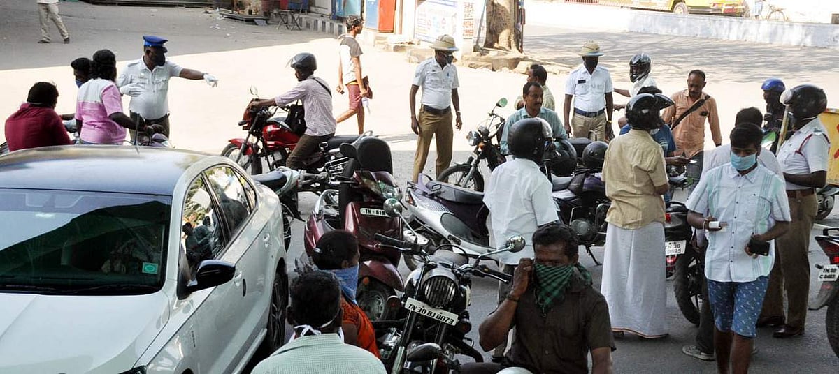 144 தடை உத்தரவை தொடர்ந்து சாலையில் இருசக்கர வாகனம் மற்றும் காரில் புதன்கிழமை பயணித்த வாகன ஓட்டிகளிடம் 300 ரூபாய் அபராதம் விதித்த போக்குவரத்து போலீஸார்.