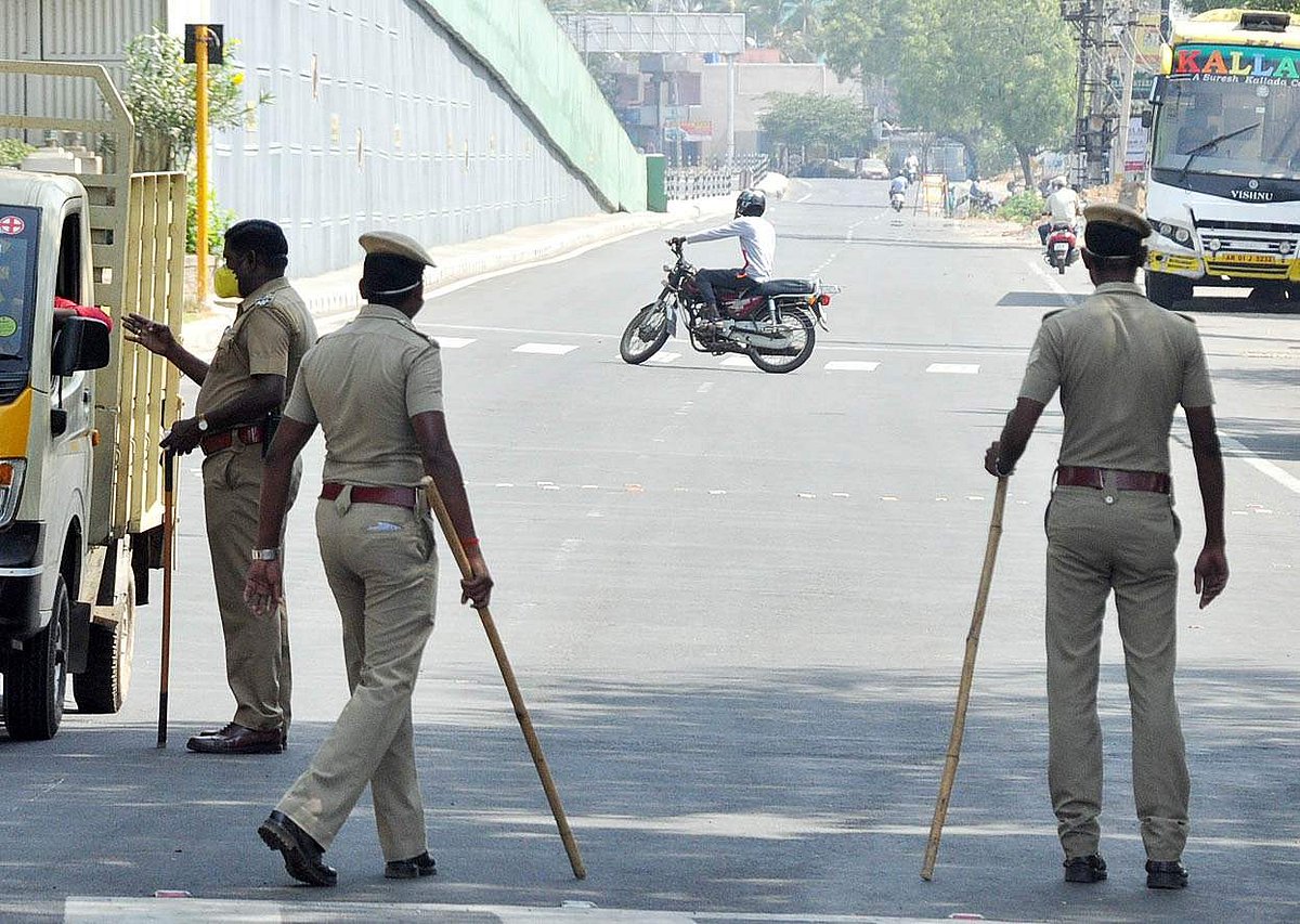 144 தடை உத்தரவை மீறி சாலையில் பயணித்த இருசக்கர வாகன ஓட்டிகளை புதன்கிழமை கைகளில் லத்தி வைத்துக்கொண்டு எச்சரித்து திருப்பி அனுப்பும் போலீஸார்.