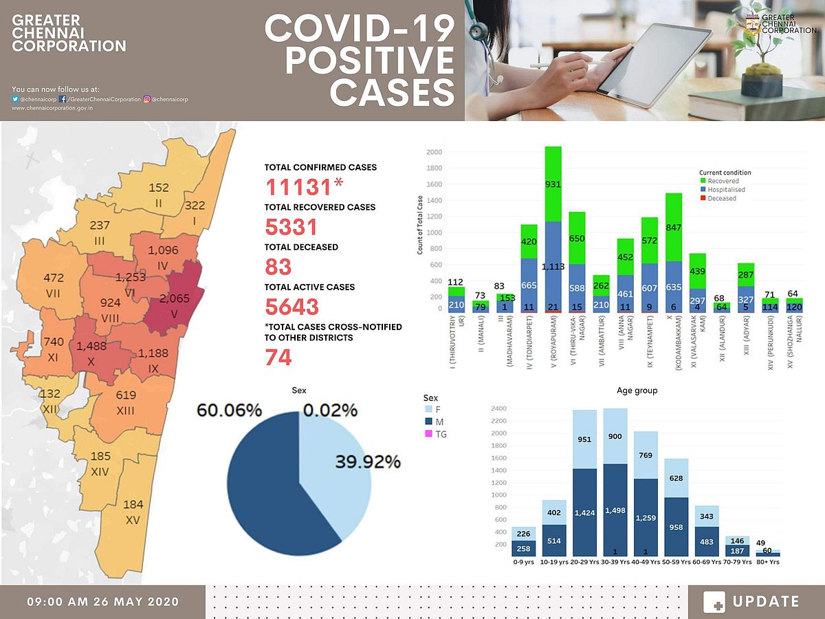 சென்னையில் இதுவரை 5,331 பேர் குணமடைந்து வீடு திரும்பினர். 5,643 பேர் மருத்துவமனைகளில் சிகிச்சை பெற்று வருகின்றனர்.
