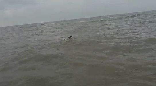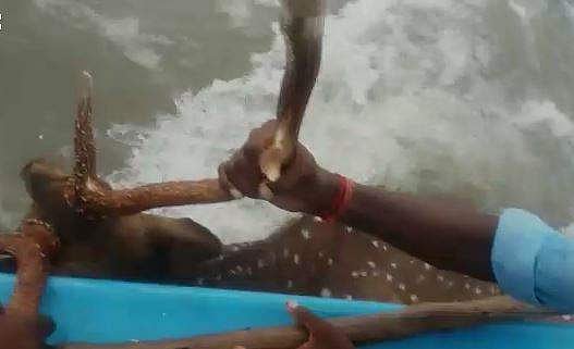 இந்நிலையில், ஆண் புள்ளிமான் ஒன்றை நாய்கள் துரத்திதியுள்ளது. தப்பித்துக் கொள்ள ஓடிய மான், ஒரு கட்டத்தில் கடலில் குதித்து நீந்தியது. தற்போது கடல் அலை வேகமாக இருப்பதால் மான் கரையில் இருந்து சுமார் ஒரு கிலோ மீட்டர் தொலைவில் உயிருக்குப் போராடும் நிலைக்கு தள்ளப்பட்டது.