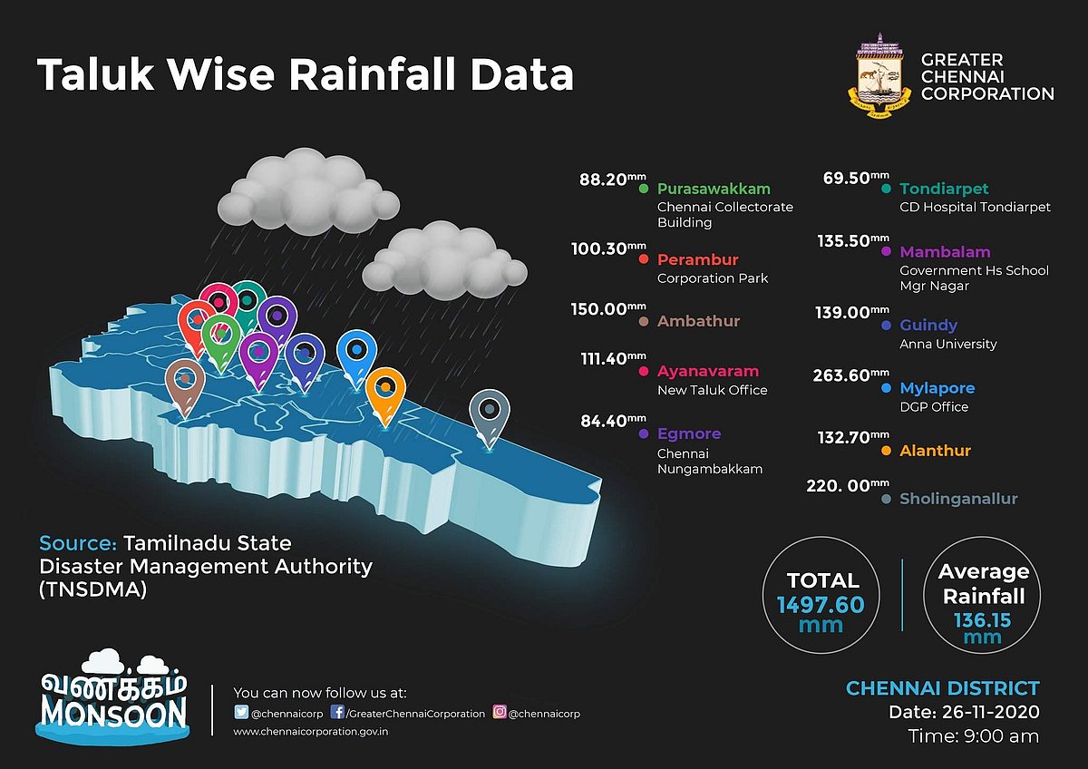 இந்த காலக்கட்டத்தில் சென்னையில் செய்திருக்கும் மழையளவு 1497 மி.மீ. ஆகும். ஆனால் சராசரி மழையளவு 136.15 மி.மீ. ஆகும்.
