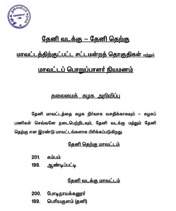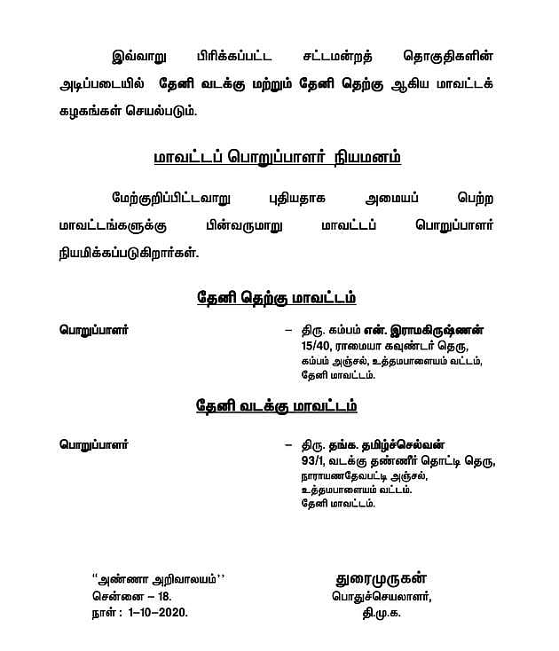 தேனி வடக்கு - தேனி தெற்கு மாவட்டத்திற்குட்பட்ட சட்டமன்றத் தொகுதிகள் மற்றும் மாவட்டப் பொறுப்பாளர்கள் நியமிக்கப்பட்டுள்ளனர்.
