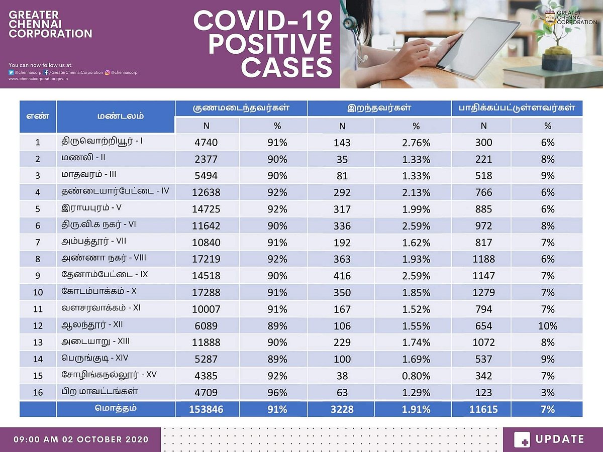 சென்னையில் இதுவரை 1,68,689 பேருக்கு கரோனா தொற்று உறுதி செய்யப்பட்டுள்ளது. இவர்களில் 1,53,846 பேர் குணமடைந்துள்ளனர். சென்னையில் அதிகபட்சமாக, கோடம்பாக்கத்தில் 1,279 பேரும் அண்ணாநகரில் 1188 பேரும் தேனாம்பேட்டையில் 1,147 பேரும் அடையாறு மண்டலத்தில் 1072 பேரும் கரோனாவுக்கு சிகிச்சை பெற்று வருகிறார்கள்.