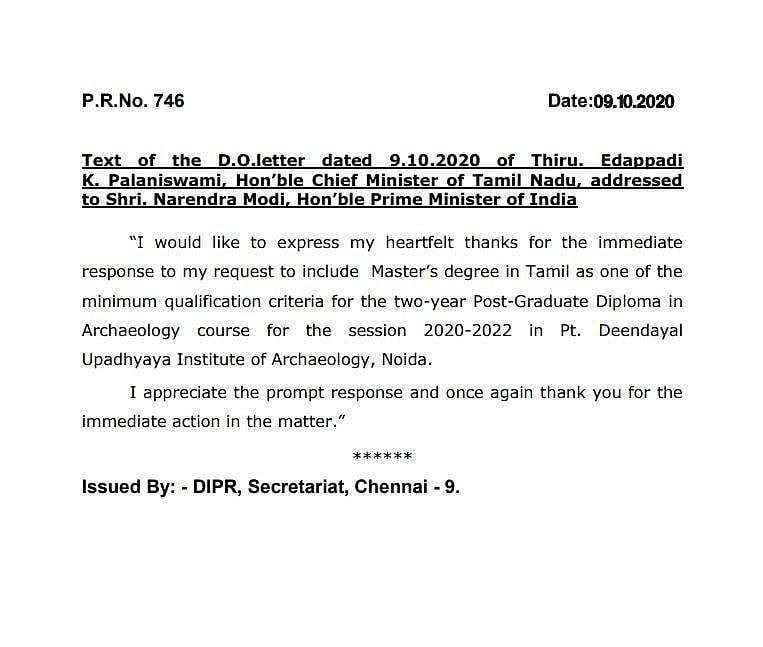 இதன் தொடர்ச்சியாக, கோரிக்கையை ஏற்று உடனடியாக நடவடிக்கை எடுத்த பிரதமர் மோடிக்கு முதல்வர் நன்றிக் கடிதம் அனுப்பியுள்ளார். தொல்லியல் முதுகலை பட்டப்படிப்புக்கான கல்வித் தகுதியில் தமிழ் மொழியையும் சேர்த்து உடனடியாக நடவடிக்கை எடுத்ததற்கு மனமார்ந்த நன்றியைத் தெரிவித்துக் கொள்வதாக முதல்வர் தனது கடிதத்தில் குறிப்பிட்டுள்ளார்.