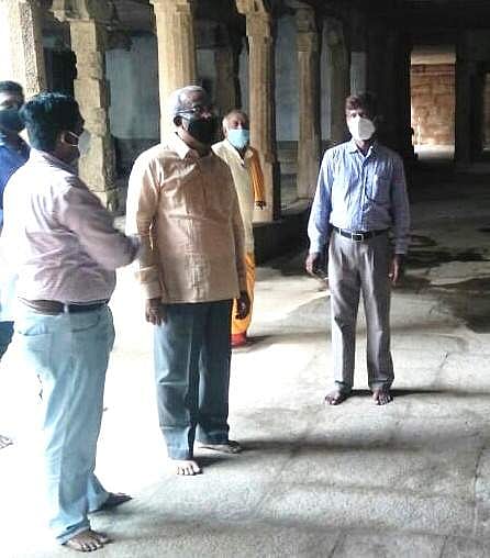 சங்ககிரி மலைக்கு செல்லும் வழியில் உள்ள அருள்மிகு வரதராஜபெருமாள் கோயில் வளாகத்தினை பார்வையிட்டு ஆய்வு செய்கிறார் தொல்லியல்துறை கண்காணிப்பாளர் ஸ்ரீராமன்
