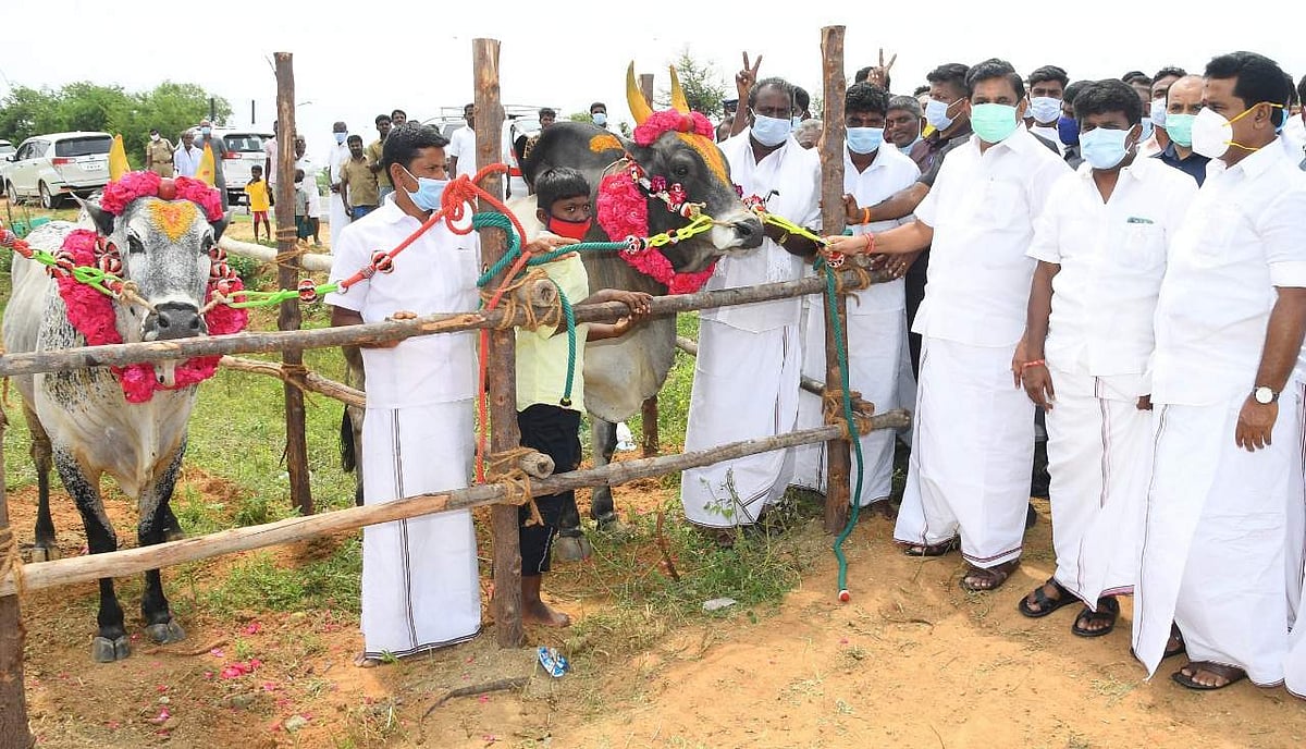 விராலிமலையில் ஜல்லிக்கட்டு காளைகளைப் பார்வையிடும் முதல்வர் எடப்பாடி கே. பழனிசாமி.