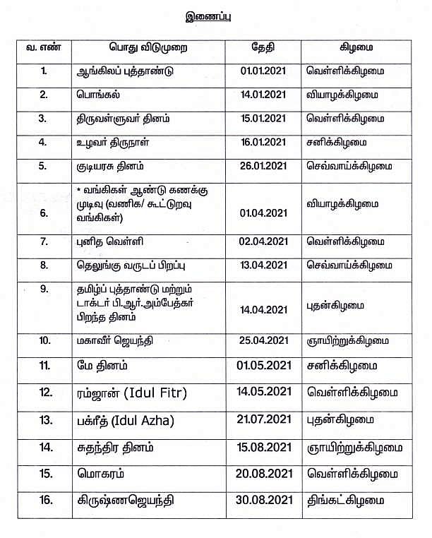 2021 - தமிழக அரசு விடுமுறை நாள்கள் அறிவிப்பு