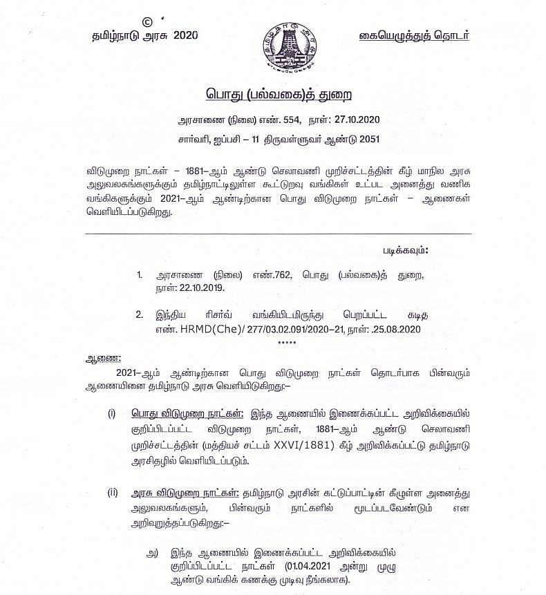 ஆண்டின் இறுதி மாதங்களில் அடுத்த ஆண்டிற்கான பொது விடுமுறை நாள்களை அரசு வெளியிடுவது வழக்கம். இந்நிலையில் 2021-ம் ஆண்டில் 23 நாள்கள் அரசு விடுமுறை என்று தமிழக அரசு அரசாணை வெளியிட்டுள்ளது.