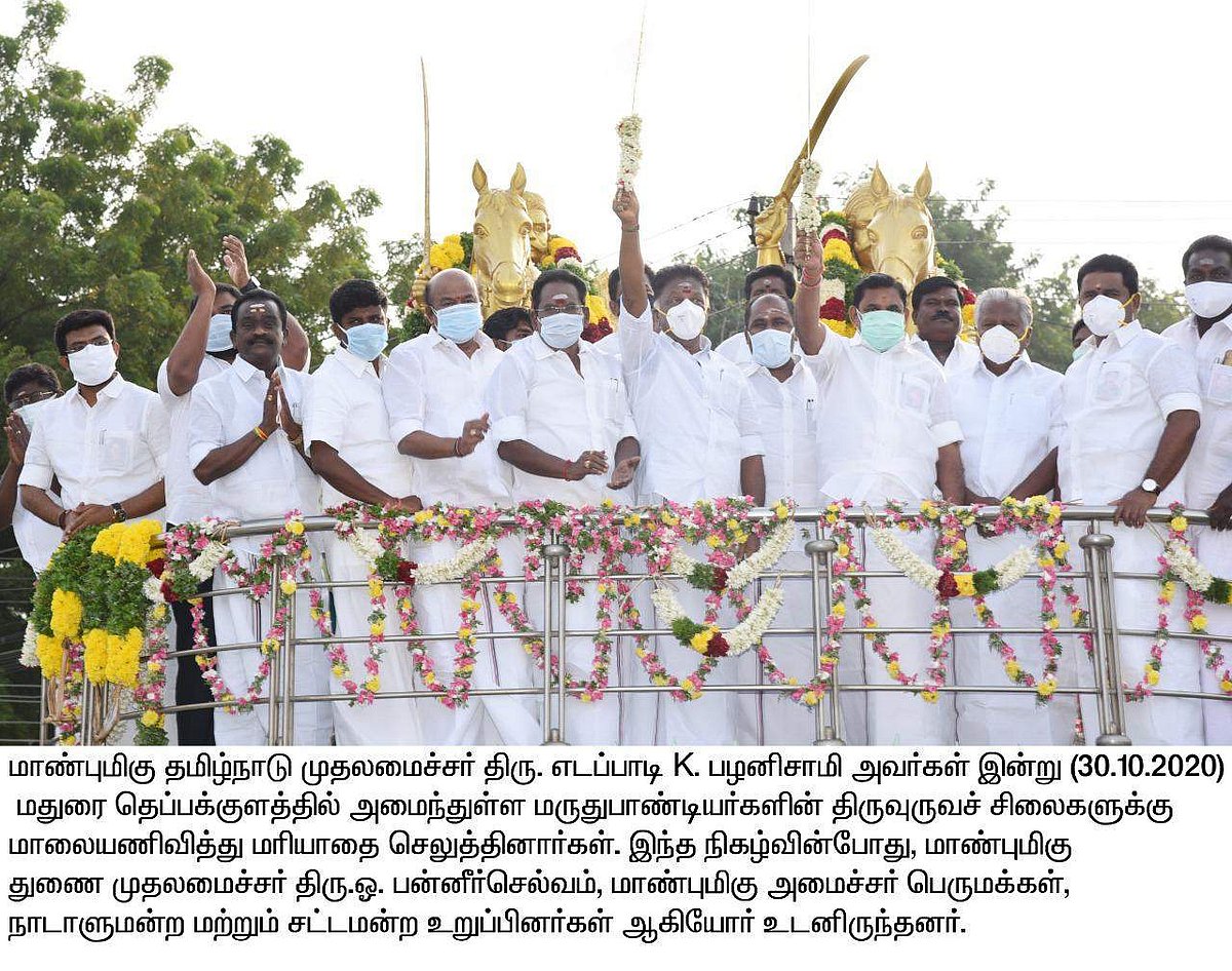 மதுரை தெப்பக்குளத்தில் உள்ள மருது பாண்டியர்கள் சிலைக்கு முதல்வர் எடப்பாடி பழனிசாமி மாலை அணிவித்து மரியாதை செலுத்தினார்.
