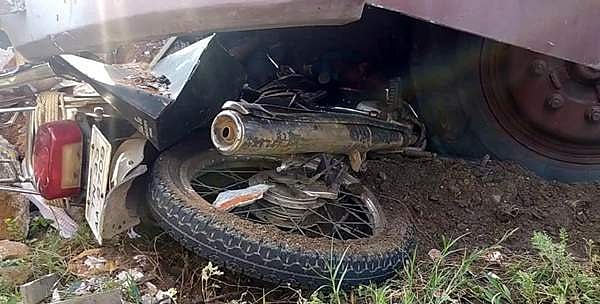 பேருந்துக்கு அடியில் கிடக்கும் இருசக்கர வாகனம்.