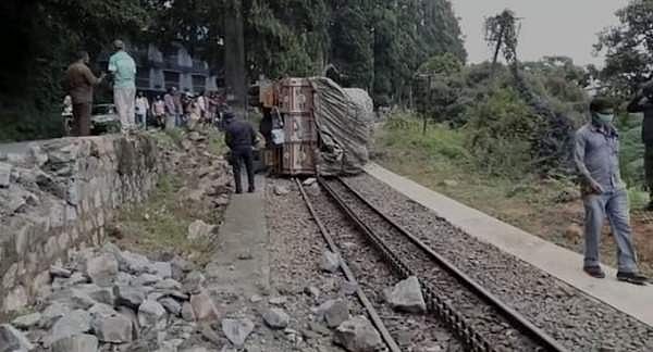 நீலகிரி மாவட்டம் குன்னூர் மேட்டுப்பாளையம் தேசிய நெடுஞ்சாலையில் சரக்குகளை ஏற்றி வந்த லாரி, சாலையில் இருந்த தடுப்புகளை உடைத்துக் கொண்டு மலை இரயில் பாதையில் 30 அடி பள்ளத்தில் விழுந்து விபத்துக்குள்