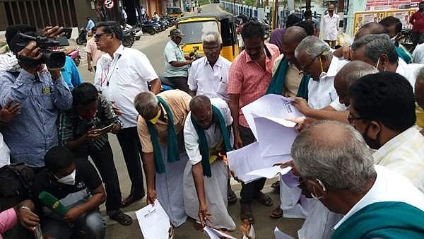தஞ்சாவூர்: மத்திய அரசுக் கொண்டு வந்துள்ள வேளாண் அவசர சட்டங்களைத் கண்டித்து தஞ்சாவூரில் காவிரி உரிமை மீட்புக் குழுவினர் ஞாயிற்றுக்கிழமை சட்ட நகல் எரிப்புப் போராட்டத்தில் ஈடுபட்டனர்.