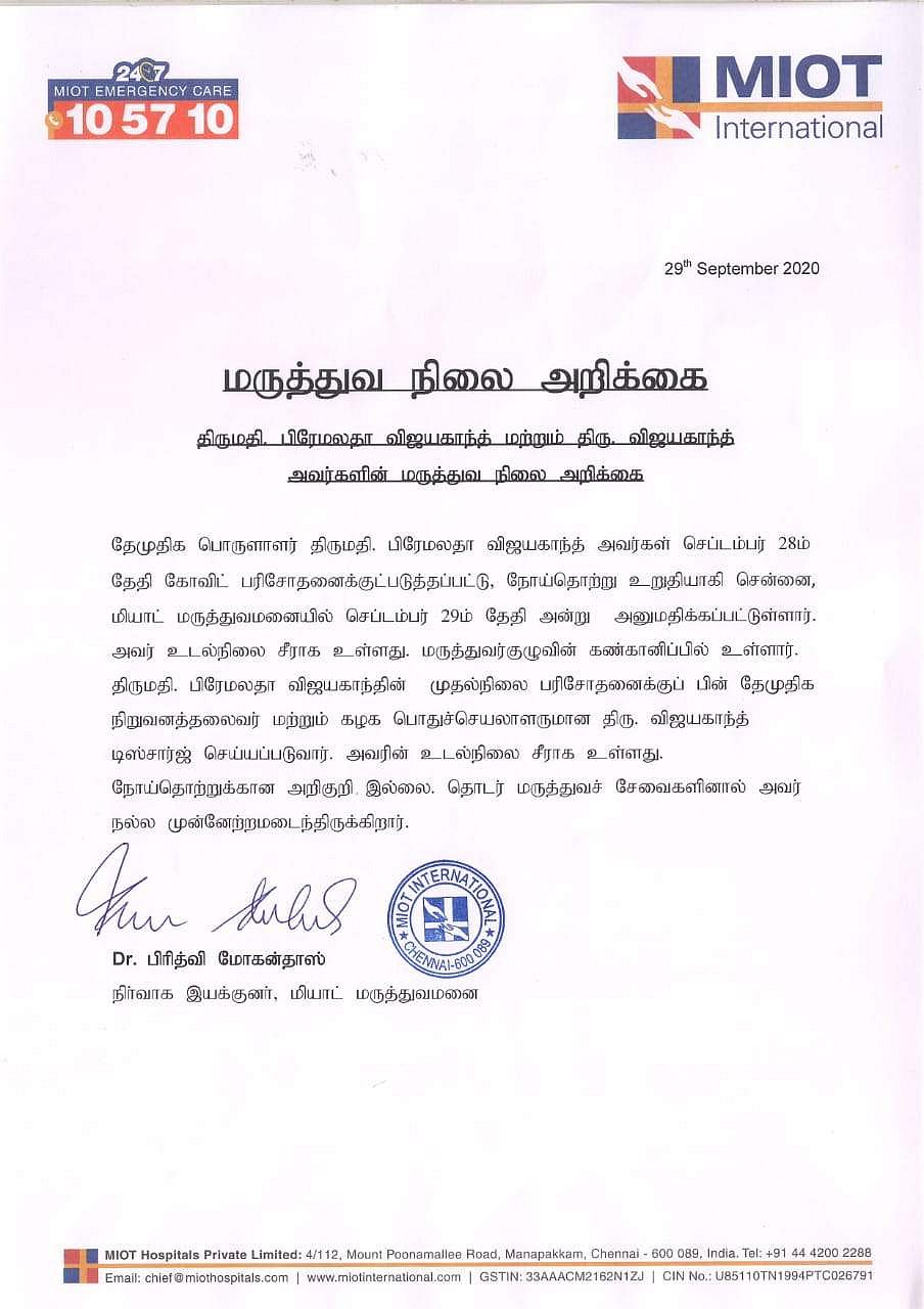 பிரேமலதா விஜயகாந்தின் முதல்நிலை பரிசோதனைக்குப் பின் தேமுதிக நிறுவனத் தலைவர் விஜயகாந்த் டிஸ்சார்ஜ் செய்யப்படுவார். அவரின் உடல்நிலை சீராக உள்ளது. நோய்த்தொற்றுக்கான அறிகுறிகள் இல்லை. தொடர் மருத்துவச் சேவைகளினால் அவர் நல்ல முன்னேற்றமடைந்திருக்கிறார்.