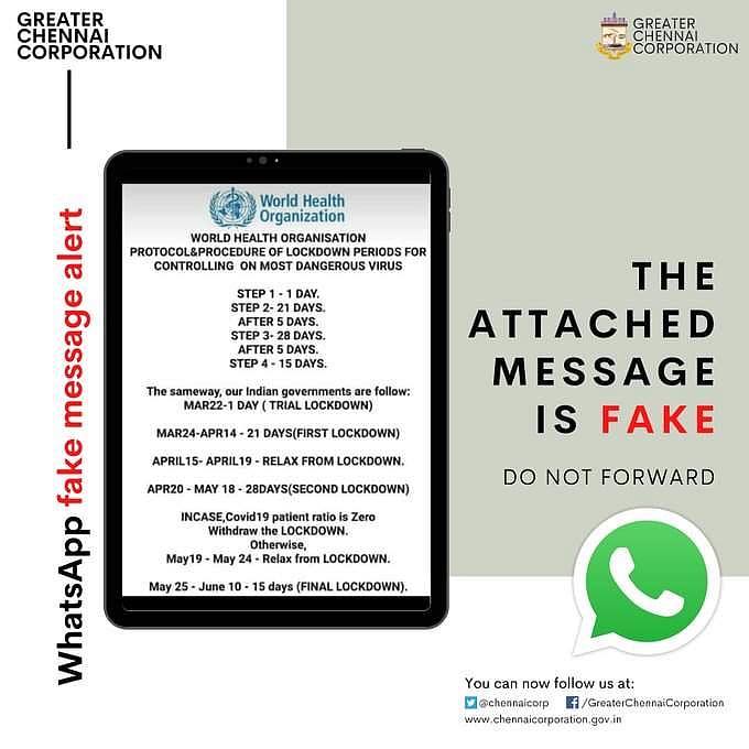 உலக சுகாதார அமைப்பின் சின்னத்துடன் வெளியான இந்த தகவல் உண்மையல்ல என்று சென்னை மாநகராட்சி சார்பில் விளக்கம் அளிக்கப்பட்டுள்ளது.