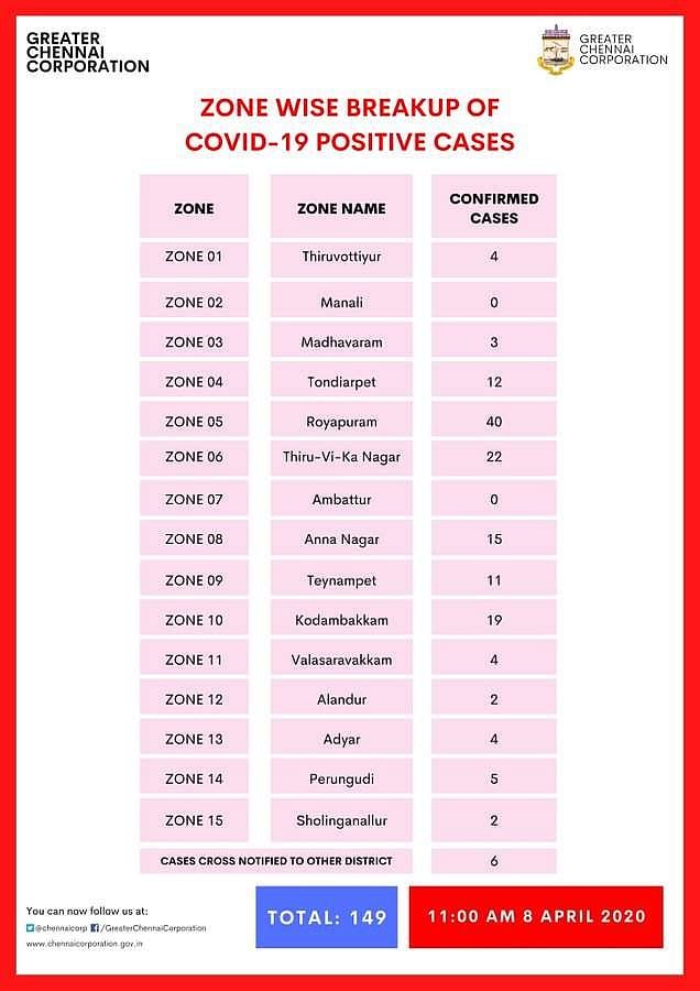 பெருங்குடியில் ஐந்து பேருக்கும், திருவொற்றியூர், வளசரவாக்கம், அடையாறு, பகுதிகளில் தலா நான்கு பேருக்கும் கரோனா உறுதி செய்யப்பட்டுள்ளது.