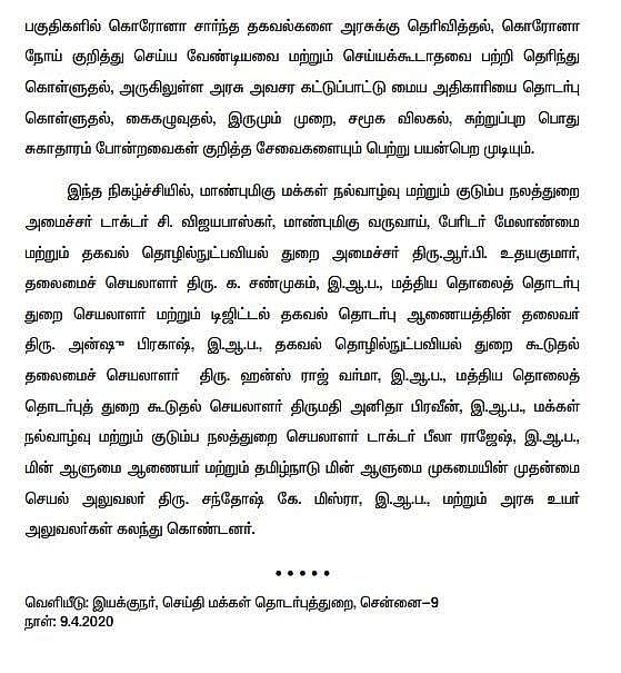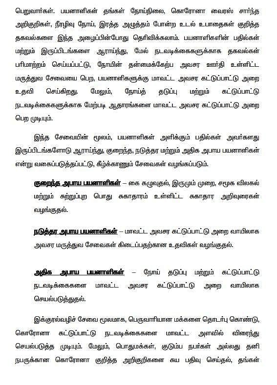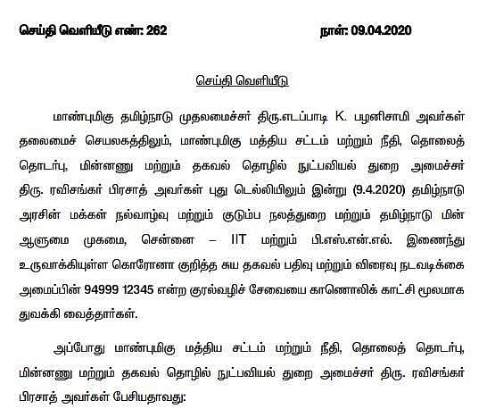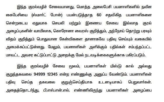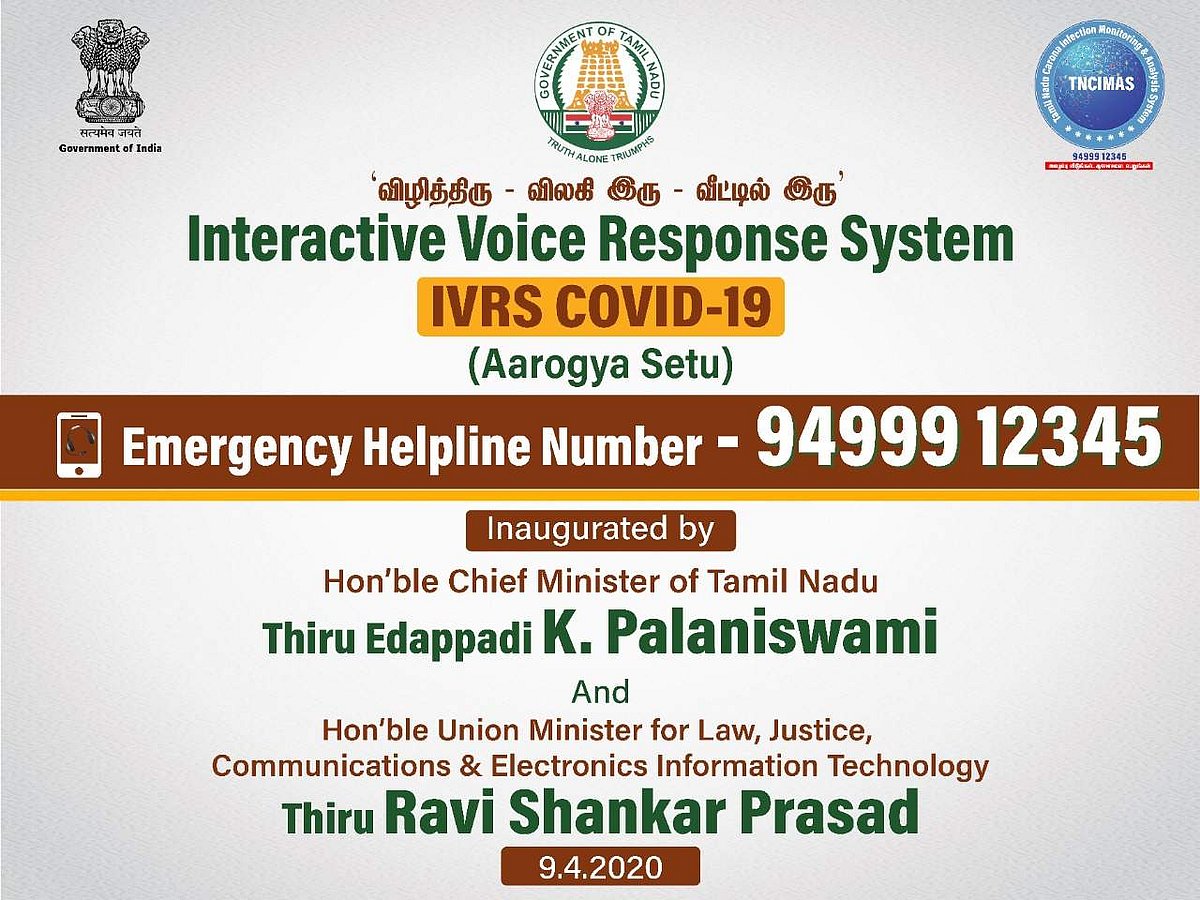 சென்னை தலைமை செயலகத்திலிருந்து காணொலி காட்சி மூலம் ஐ.வி.ஆர்.எஸ். தானியங்கி குரல் வழி சேவை அறிமுகம் செய்யப்பட்டது. அதன்படி, கரோனா நோய்த் தொற்று தொடர்பான விளக்கங்களை 94999 12345 என்ற அவசர உதவி எண்ணில் பெறலாம் எனவும் தகவல் தெரிவிக்கப்பட்டுள்ளது.