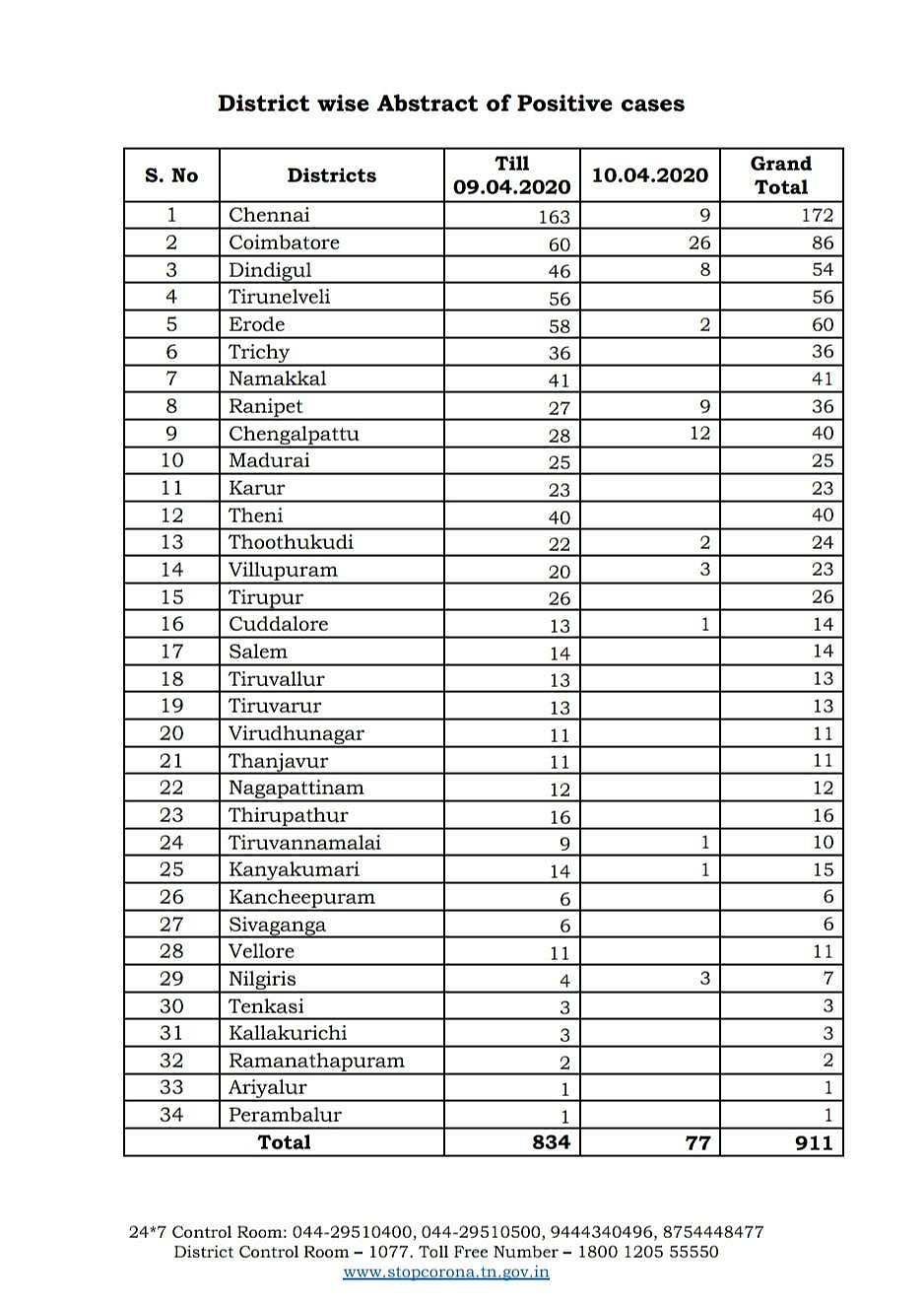 தமிழகத்தில் கரோனா வைரஸ் நோய்த் தொற்றால் மொத்தம் பாதிக்கப்பட்டோரின் எண்ணிக்கை 911 ஆக அதிகரித்துள்ளது. சென்னையில் அதிகபட்சமாக 172 பேருக்கு கரோனா தொற்று உறுதி செய்யப்பட்டுள்ளது.