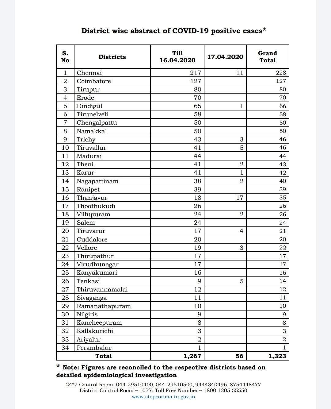 தமிழகத்தில் கரோனா பாதிப்பு 1,267 ஆக இருந்த நிலையில் தற்போது பாதிப்பு எண்ணிக்கை 1,323 ஆக அதிகரித்துள்ளது.