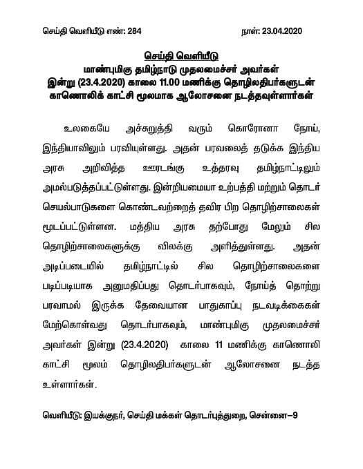 தொழிற்சாலைகள் இயங்கும் பட்சத்தில், கரோனா பரவாமல் இருக்க தேவையான பாதுகாப்பு நடவடிக்கைகளை எடுக்கும்படி தொழிலதிபர்களிடம் வலியுறுத்தி வருவதாக கூறப்படுகிறது.