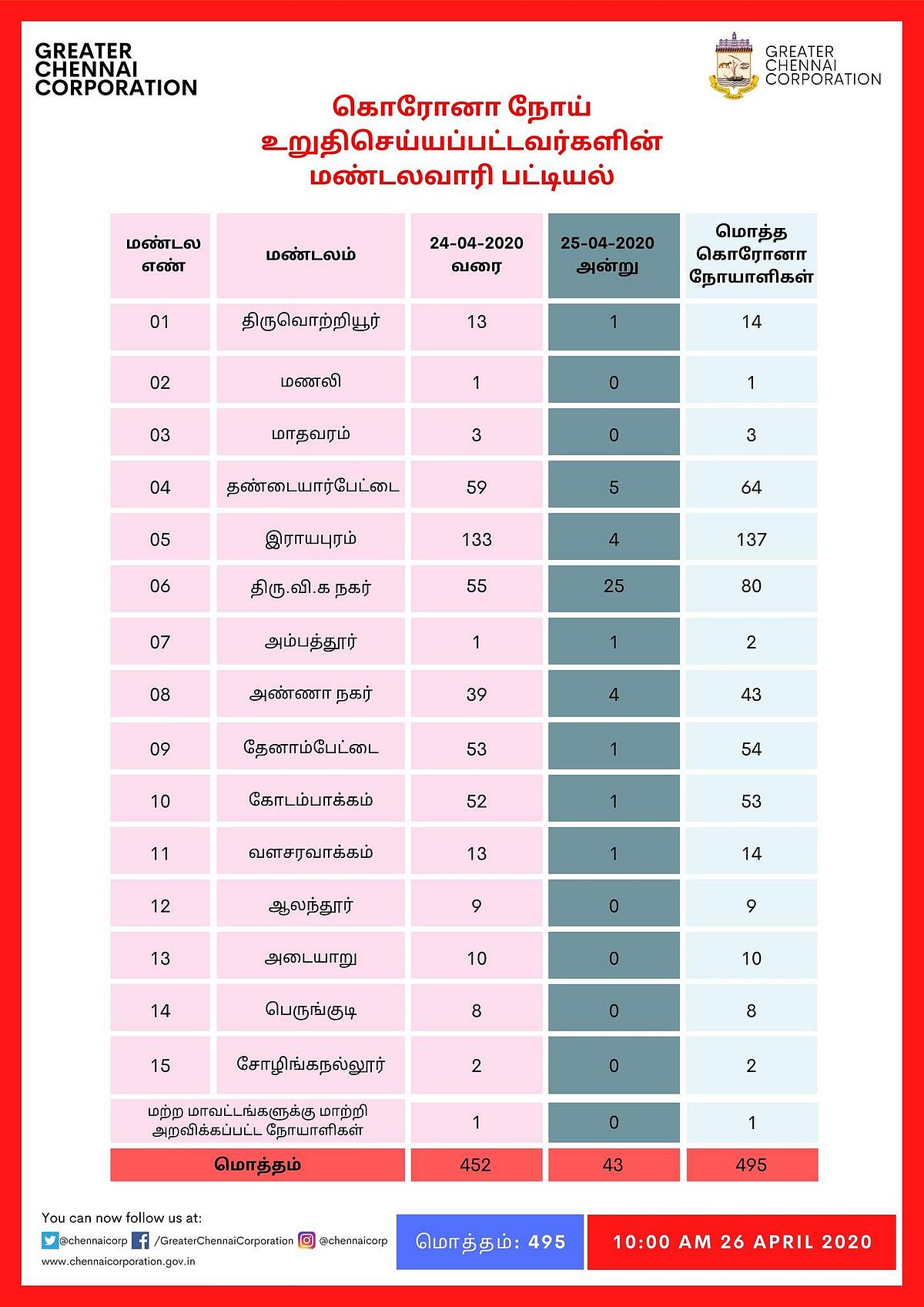 தொடர்ந்து, சென்னையில் மண்டலவாரியாக கரோனா பாதித்தவர்கள் எண்ணிக்கையை சென்னை மாநகராட்சி இன்று வெளியிட்டுள்ளது.