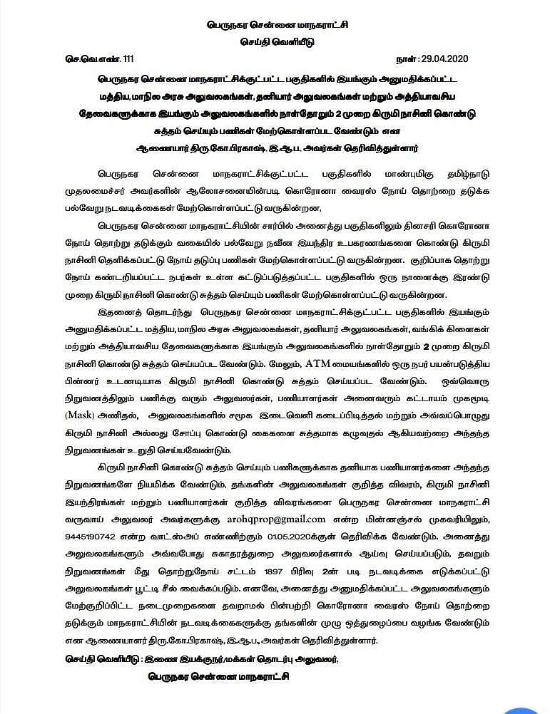 சென்னை மாநகராட்சிப் பகுதியில் அத்தியாவசியத் தேவைக்காக இயங்கும் அரசு, தனியார் அலுவலகங்கள், வங்கிகளில் தினமும் 2 முறை கிருமிநாசினி தெளித்து சுத்தம் செய்யப்பட வேண்டும் என சென்னை மாநகராட்சி அறிவுறுத்தியுள்ளது.