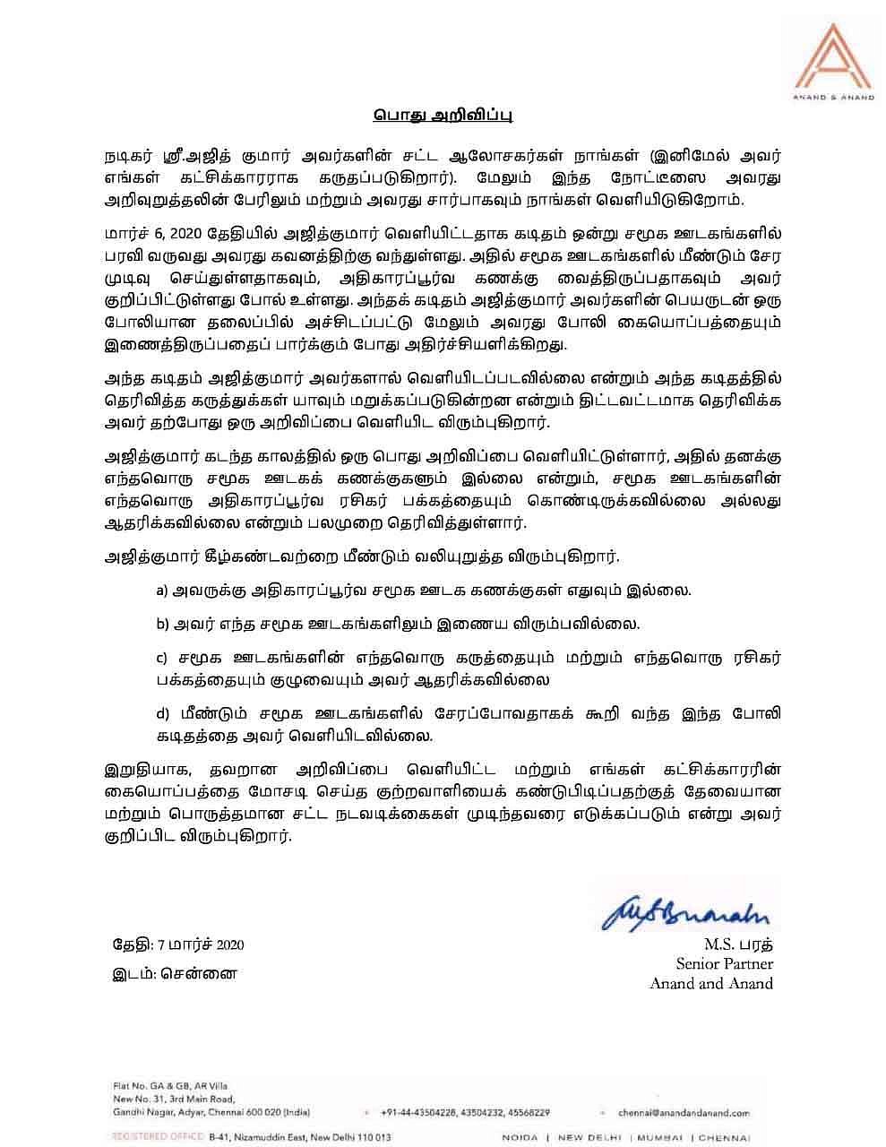 மீண்டும் சமூக ஊடகங்களில் சேரப்போவதாகக் கூறி எந்த கடிதத்தையும் வெளியிடவில்லை என்று அஜித்குமார் தெரிவித்துள்ளார்.