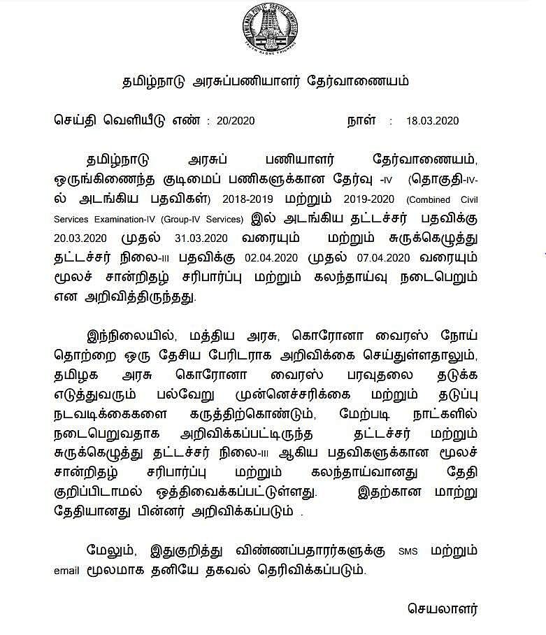 இந்நிலையில், கரோனா வைரஸை மத்திய அரசு தேசிய பேரிடராக அறிவித்துள்ளதாலும், காரோனாவைத் தடுக்க மாநில அரசு பல்வேறு முன்னெச்சரிக்கை நடவடிக்கைகளை எடுத்து வருவதாலும் குரூப் 4 சான்றிதழ் சரிபார்ப்பு மற்றும் கலந்தாய்வு ஒத்தி வைக்கப்படுகிறது. இதற்கான மாற்று தேதி பின்னர் அறிவிக்கப்படும். இதுகுறித்து விண்ணப்பதாரர்களுக்கு எஸ்.எம்.எஸ் மற்றும் இமெயில் மூலமாக தகவல் தெரிவிக்கப்படும்' என்று கூறப்பட்டுள்ளது.