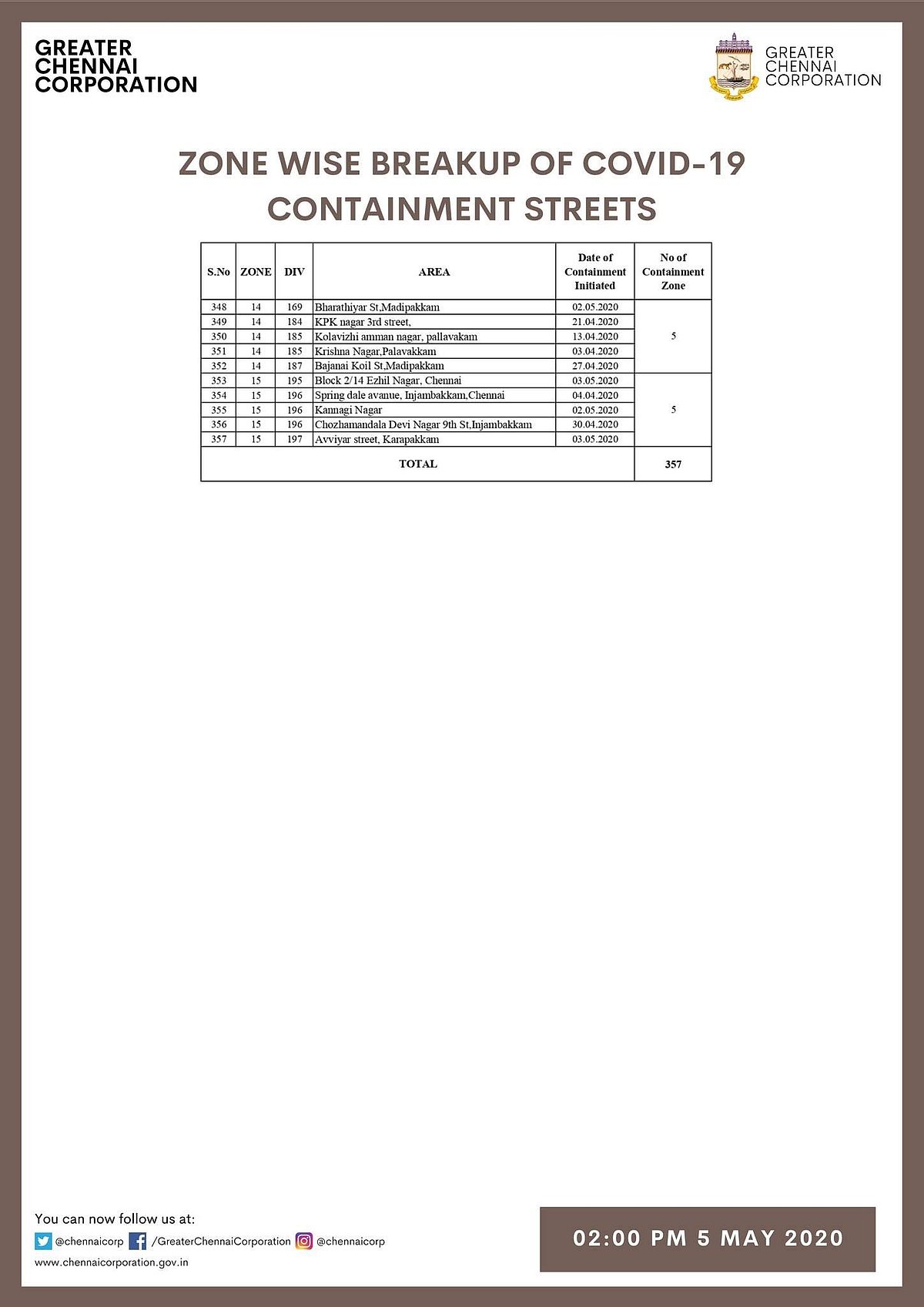 சென்னையில் கட்டுப்படுத்தப்பட்ட பகுதிகளின் எண்ணிக்கை 357 ஆக உயர்ந்துள்ளது.
