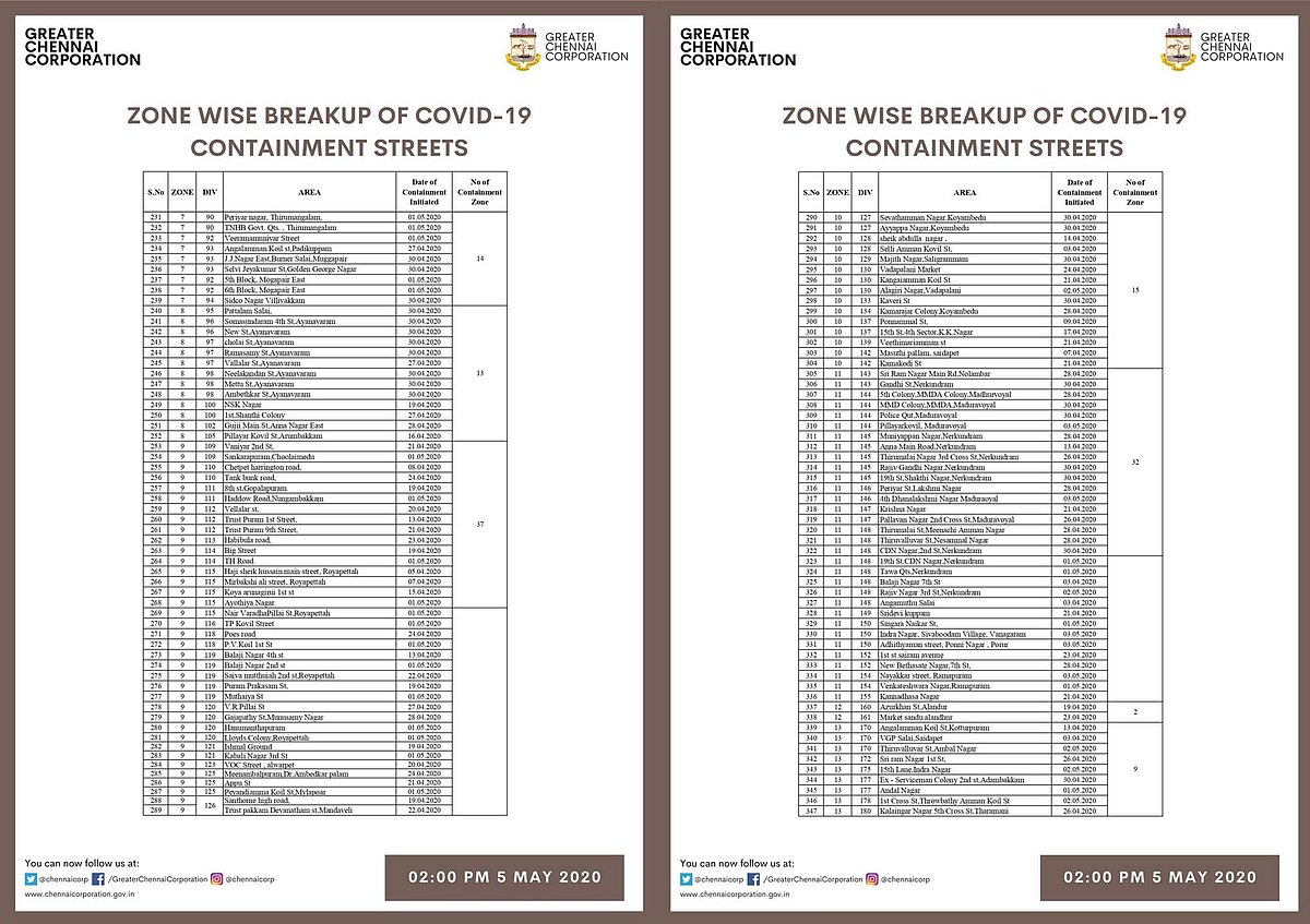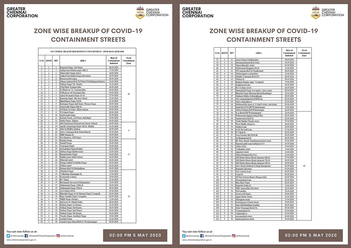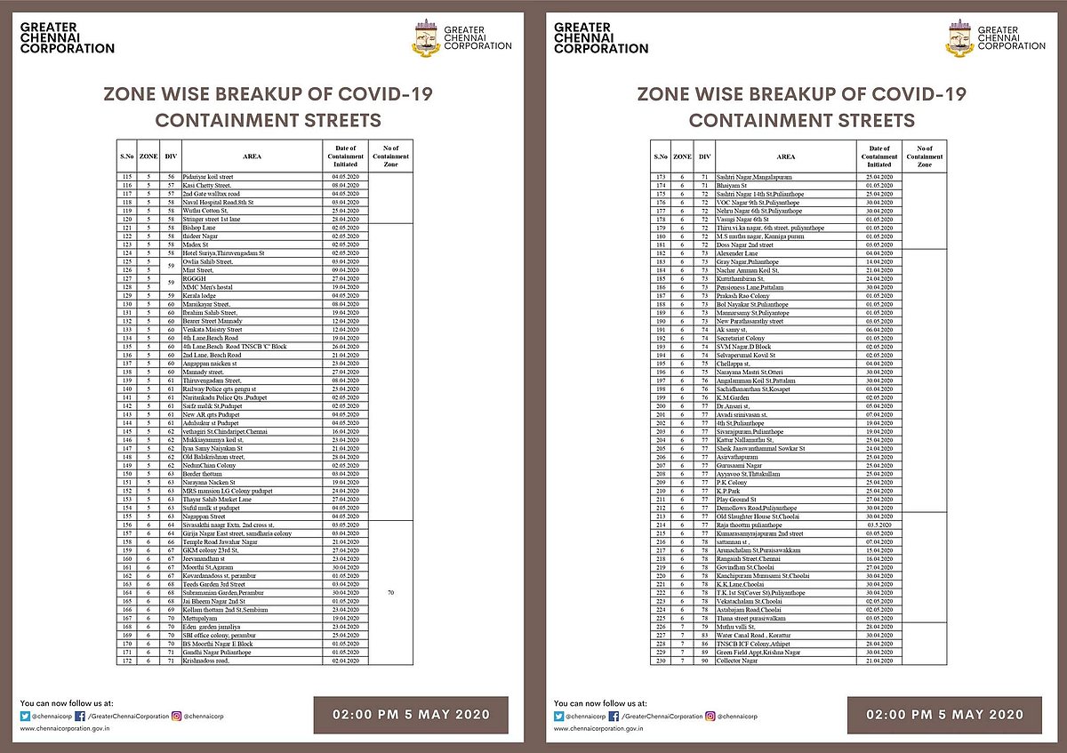 கரோனா வைரஸ் பாதித்த நோயாளிகள் அதிகம் பேர் இருக்கும் பகுதிகள் கட்டுப்படுத்தப்பட்ட பகுதிகளாக அறிவிக்கப்படும். இந்தப் பகுதிகளுக்கு எவ்வித தளர்வுகளும் பொருந்தாது. இந்த நிலையில் சென்னை மாநகராட்சிக்குட்பட்ட கட்டுப்படுத்தப்பட்ட பகுதிகளின் சமீபத்திய பட்டியலை சென்னை மாநகராட்சி வெளியிட்டுள்ளது.