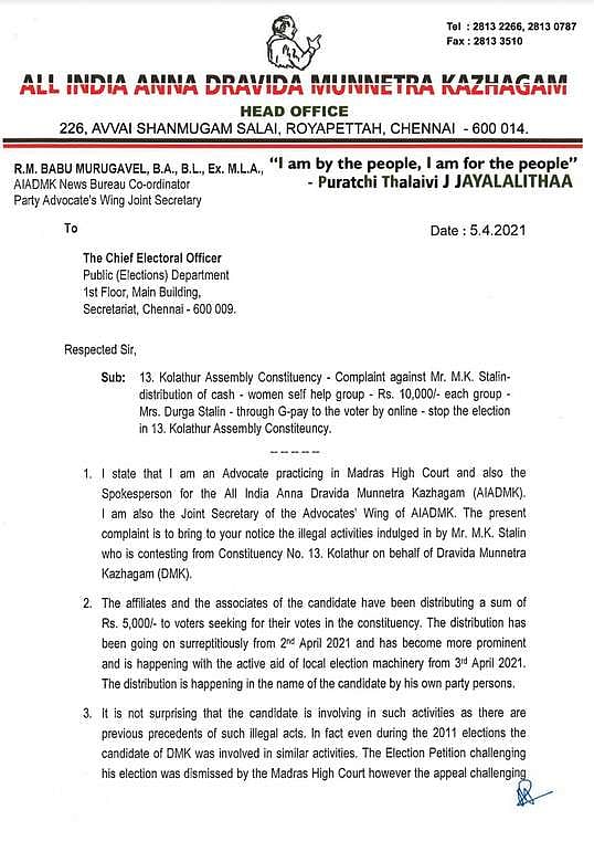 கொளத்தூர் தொகுதியில் தேர்தலை ரத்து செய்ய அதிமுக சார்பில் அளிக்கப்பட்டக் கடிதம்