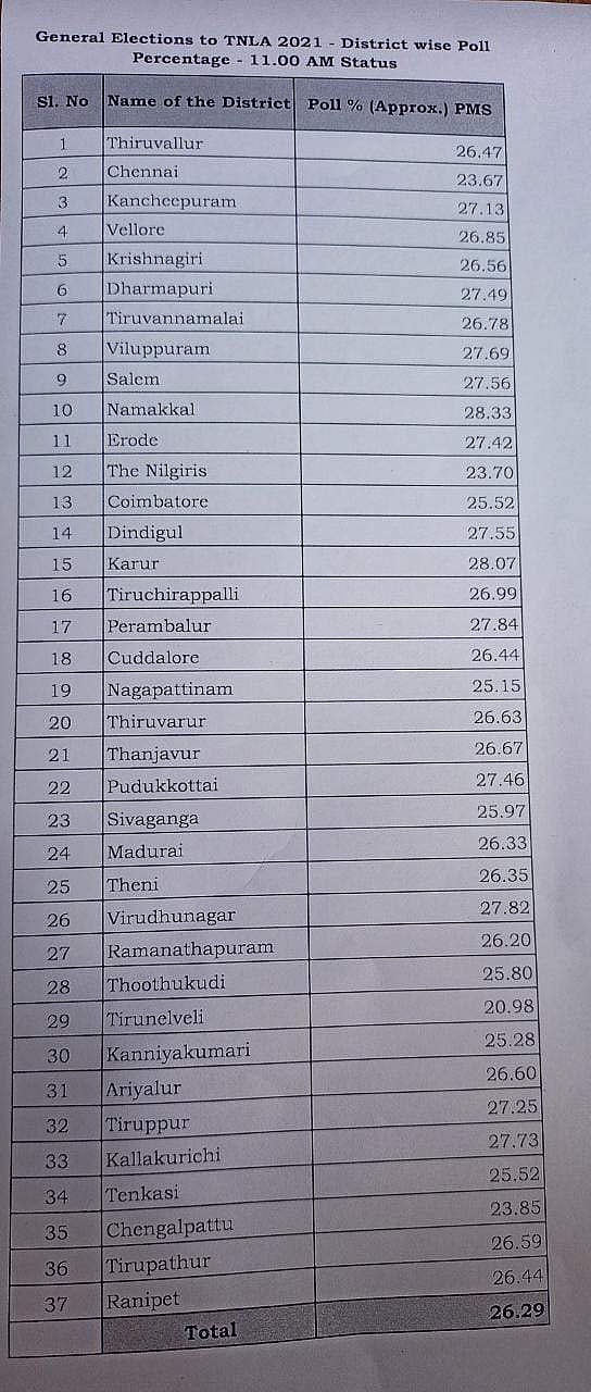தமிழகத்தில் 11 மணி நிலவரப்படி 26.29% வாக்குப்பதிவு; நாமக்கல் முதலிடம்