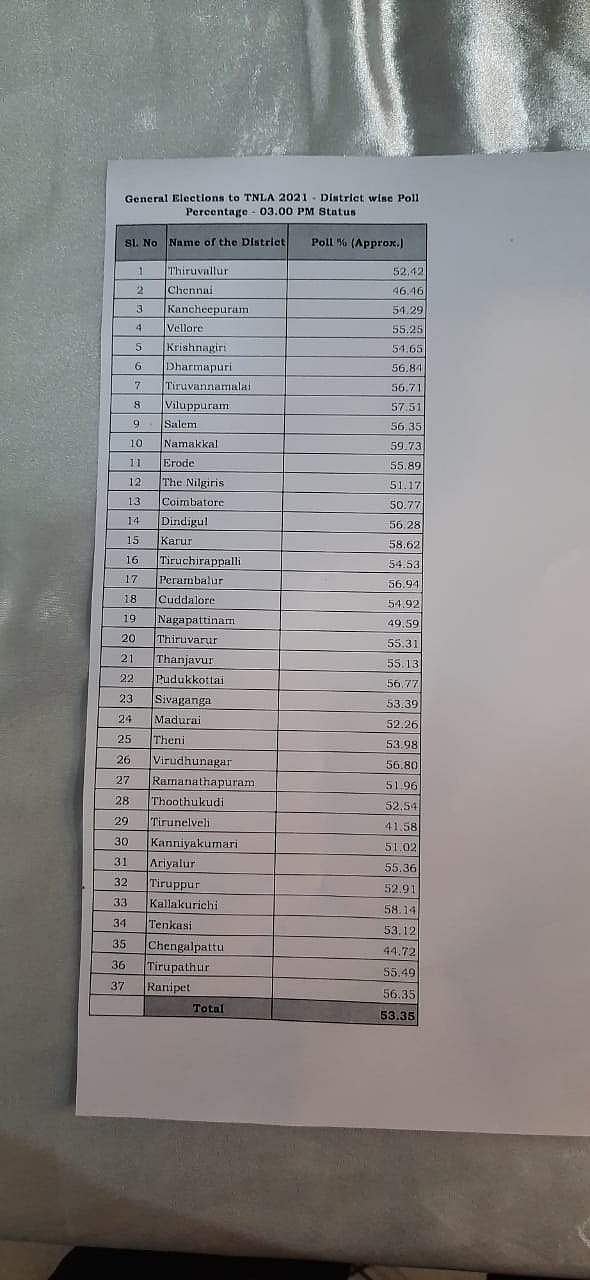 அதன்படி, இன்று பிற்பகல் 3 மணியளவில் தமிழகத்தில் ஒட்டுமொத்தமாக 53.35 சதவிகித வாக்குகள் பதிவாகியிருப்பதாகத் தெரிவித்துள்ளார்.