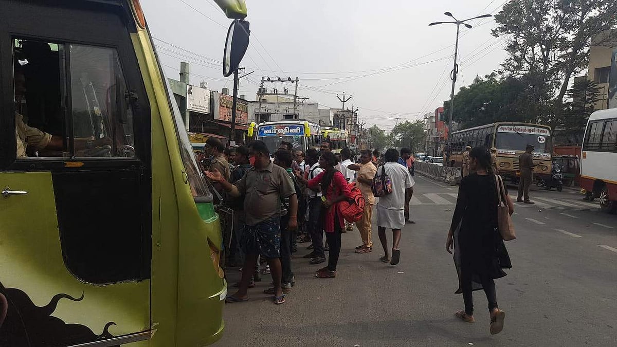 திருப்பூர் புதிய பேருந்து நிலையம் பகுதியில் வெளியூருக்குச் செல்ல பேருந்துகள் இல்லாததால் பொதுமக்கள் சாலை மறியல்.