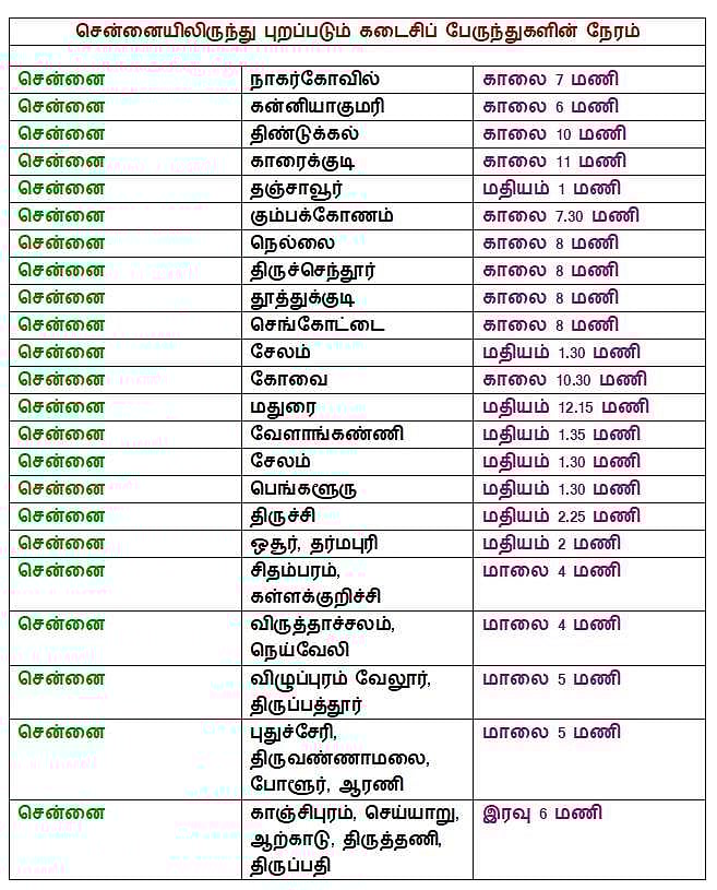 கடைசிப் பேருந்து காலை 6 மணி- கன்னியாகுமரி: சென்னையிலிருந்து புறப்படும் கடைசிப் பேருந்துகளின் நேரம்