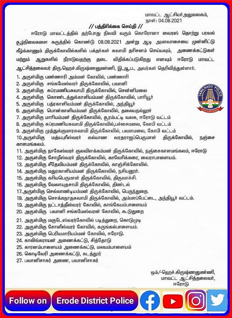 ஈரோடு மாவட்டத்தில் தற்போது நிலவி வரும் கரோனா பரவல் சூழ்நிலையைக் கருத்தில் கொண்டு, ஆடி அமாவாசையான ஞாயிற்றுக்கிழமை (ஆகஸ்ட் 8) கோயில்களில் பக்தா்கள் சுவாமி தரிசனம் செய்யவும், அணைக்கட்டுகள், ஆறுகளில் நீராடுவதற்கும் தடை விதிக்கப்படுகிறது.