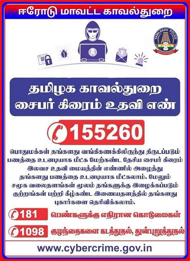 மேலும், சைபர் பிரிவு காவல்துறையினருக்கு புகார் அளிப்பது தொடர்பாகவும் ஒரு விழிப்புணர்வு புகைப்படம் வெளியிட்டுள்ளனர்.
