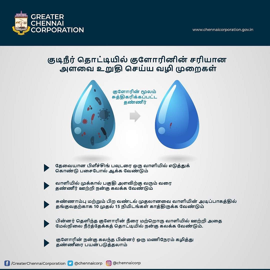 குடி நீர்த் தொட்டியில் குளோரினின் சரியான அளவை உறுதி செய்ய வழி முறைகள் இதோ என்று பதிவிடப்பட்டுள்ளது.
