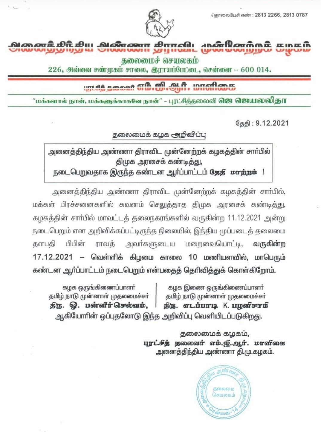 அதிமுக ஆர்ப்பாட்டம் டிச. 17 ஆம் தேதிக்கு மாற்றம்
