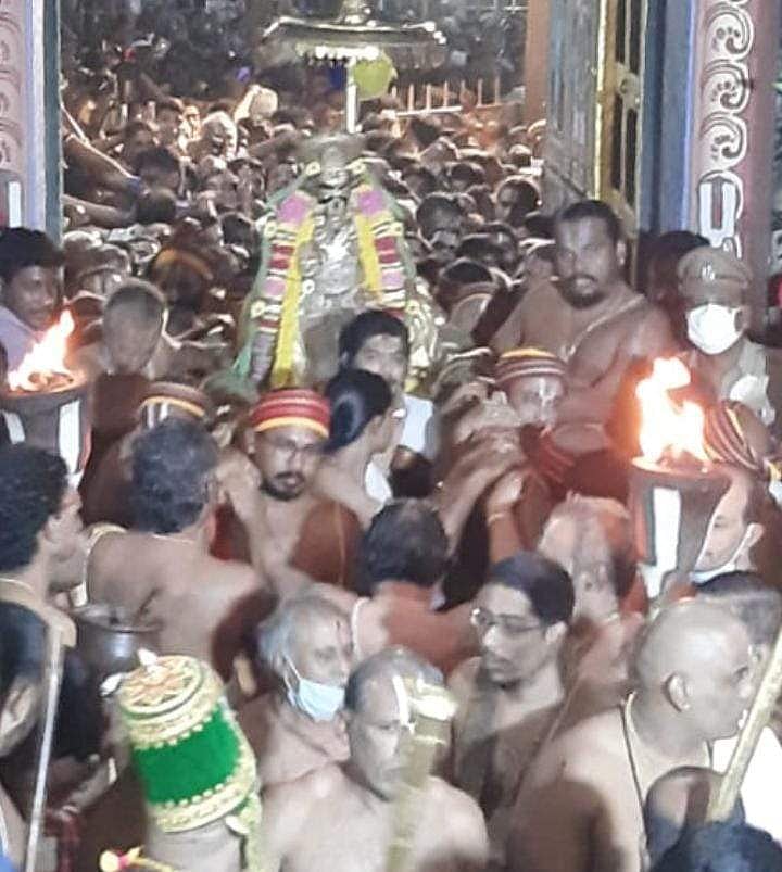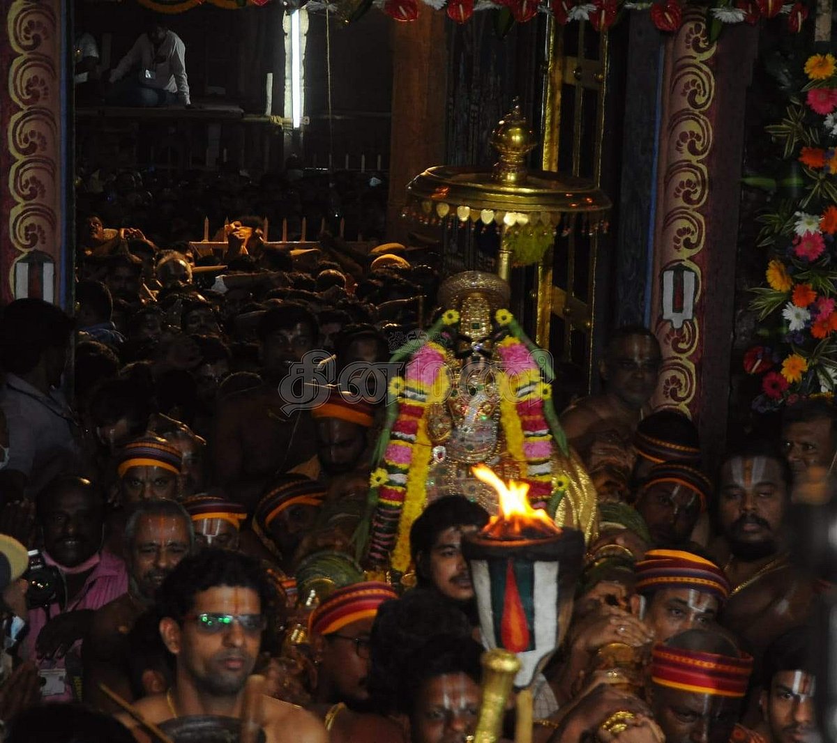 ஸ்ரீரங்கத்தில் பரமபதவாசல் திறப்பு நிகழ்வை முன்னிட்டு மூலஸ்தானத்திலிருந்து ராஜமகேந்திரன் சுற்று வழியாக பரமபதவாசல் நோக்கி செவ்வாய்க்கிழமை அதிகாலை 3.30 மணிக்கு புறப்பட்டு சென்ற நம்பெருமாள்.