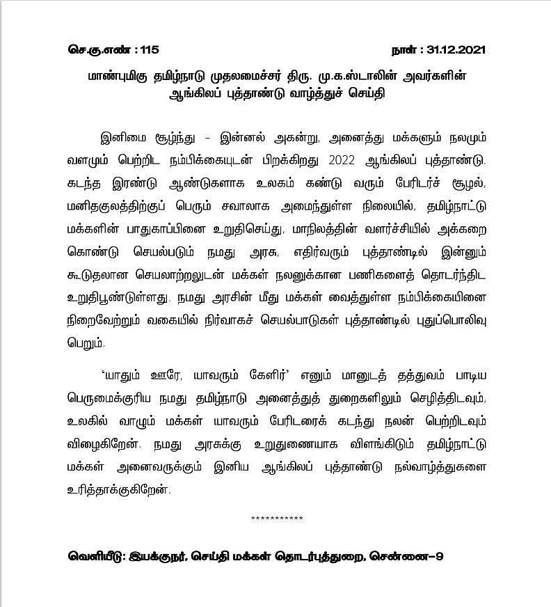 கடந்த இரண்டு ஆண்டுகளாக உலகம் கண்டு வரும் பேரிடர்ச் சூழல், மனிதக்குலத்திற்குப் பெரும் சவாலாக அமைந்துள்ள நிலையில், தமிழ்நாட்டு மக்களின் பாதுகாப்பினை உறுதிசெய்து, மாநிலத்தின் வளர்ச்சியில் அக்கறை கொண்டு செயல்படும் நமது அரசு, எதிர்வரும் புத்தாண்டில் இன்னும் கூடுதலான செயலாற்றலுடன் மக்கள் நலனுக்கான பணிகளைத் தொடர்ந்திட உறுதிபூண்டுள்ளது.
