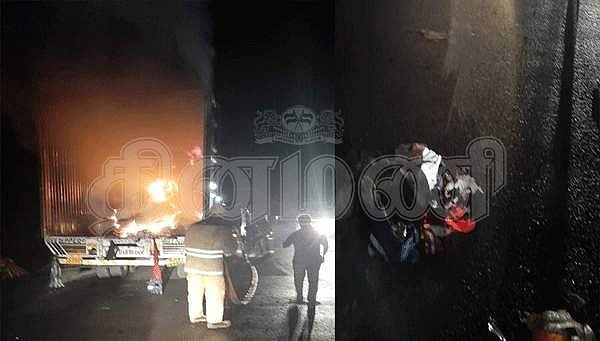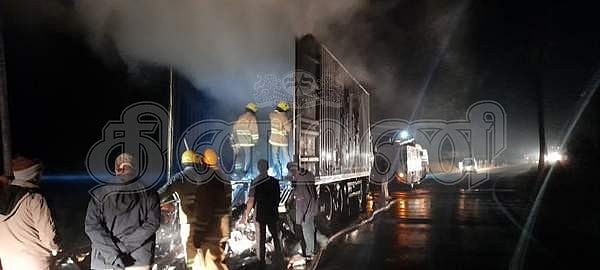 கிருஷ்ணகிரி அருகே சரக்குப் பெட்டக லாரியில் தீ: பல லட்சம் மதிப்பிலான துணிகள் எரிந்து சேதம்