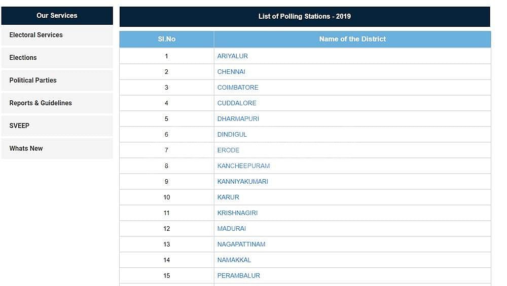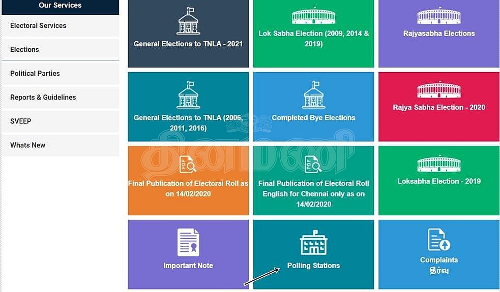 எலக்ஷ்ன்ஸ் பக்கத்தில் போலிங் ஸ்டேஷ்னை கிளிக் செய்து, அதில் உங்கள் மாவட்டத்தை தேர்வு செய்து, அதில் உங்கள் பகுதியை தேர்வு செய்ய வேண்டும்.