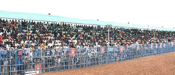 ஜல்லிக்கட்டுப் போட்டியை பாா்வையாளா் மாடங்களில் அமர்ந்திருந்து பார்க்கும் பார்வையாளர்கள்.