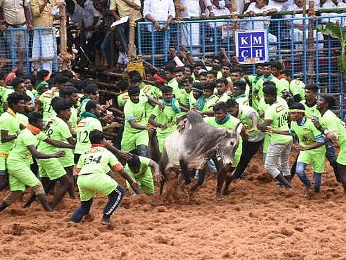 சீறிப்பாய்ந்து வரும் காளைகளும் அதனை பிடித்தும் அடக்கும் மாடுபிடி வீரர்களும்.