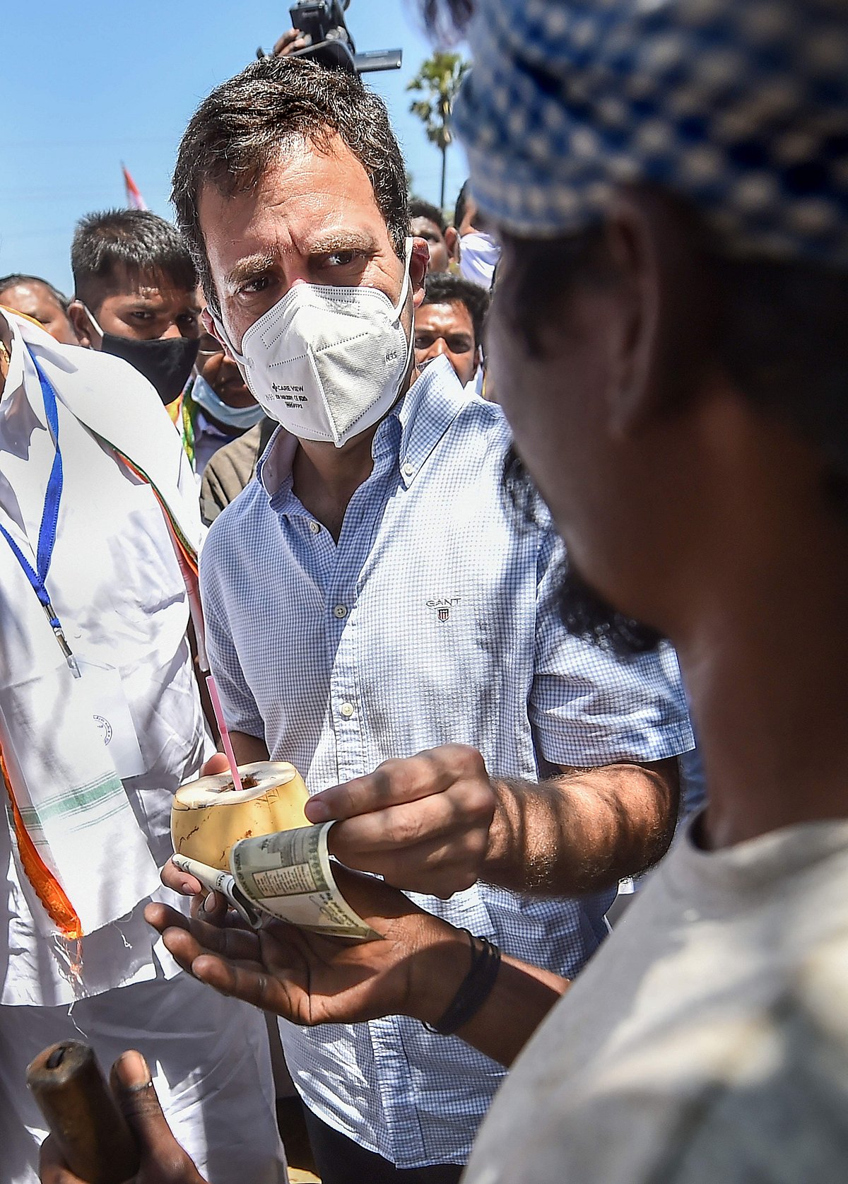 அப்போது வழியில் இறங்கி தனது உதவியாளர்களுடன் இளநீர் குடித்த ராகுல் காந்தி, இளநீர் வியாபாரியுடன் கலந்துரையாடினார்.